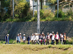 | コースも半分を過ぎた 板倉町 にある山ア農園で苺を売っていました。千葉さんがパックに入った苺を「食べない ? 」と勧めてくれます。「いただきます」「甘〜い」「おいしい」と次々手が伸びます。皆さん試食と勘違いしていませんか。千葉さんが買ったものですゾ。 「今日は夏も近づく何夜かな ? 」等と言いながら、左耳で鶯の鳴声、右耳でかじかの鳴声を聞き、田植えにいそしむ農作業を眺めながらのハイキング。「あっ、あざみだ。珍しい」「鮮やかだな、キンセンカ」―。身体の中が綺麗になっていくようです。 「水辺の郷公園」で休憩した後いよいよラストスパート。全員の集合場所「太陽の広場」に向け一直線――。と思ったらこれが相当な‘胸つき八丁'。お腹はペコペコ、息はゼイゼイで汗ダクダクの‘ガンバ'ですが、予定どおりの正午に全員無事に到着。先着のファミリーコース完歩の方と、季節柄青空に泳ぐ「鯉のぼり」が迎えてくれました。 健脚コースを完歩した5年生の上部華子さんは「あまり疲れなかったです。いつもテニスしているからかな」とケロリ。フラフラのリポーターは「参った、お見事」のみです。 各自治会に別れての昼休みは、素晴らしいコミュニケーションの場でもあるようです。海浜町内会は野津さんが「背比べ」等のハモニカ演奏をすると「今度は私に貸して」と次々名演奏。さては‘アカデミック自治会'なのでしょうか? |