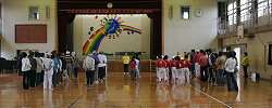 | 「M@WS理事で、教士の資格をもつ高橋さんを中心に15人の少年少女。基本練習を見せてもらいましたが、先生の挨拶時に体育館の床にキチンと正座。「これが必要なんだよ。行儀も姿勢も気持ちもよくなるに違いない」とはベテラン男性の感想でした。 | ![]() |