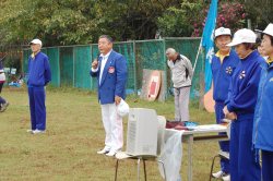 8時半の集合時間前には、今年も幕張ハイツの皆さんにコース設営に尽力願った会場に全チームが集合し、「今や遅し」と開会式待ちます。 8時40分からの開会式は、溝端社体振、笹木コミ懇両会長から挨拶を受け、参加者・スタッフ全員で準備体操を行った後の9時、A、Bコース、各13ホールで一斉スタート、前日‘「マイナビABC」で石川遼君が優勝’のホットニュースを皆さんご存知のためか「私だって負けないワ」と意気込みムンムンのスタート風景でした。全員が緑色の帽子を着用したインター町内会の皆さんのニコニコ顔がひときわ目立ちます。
